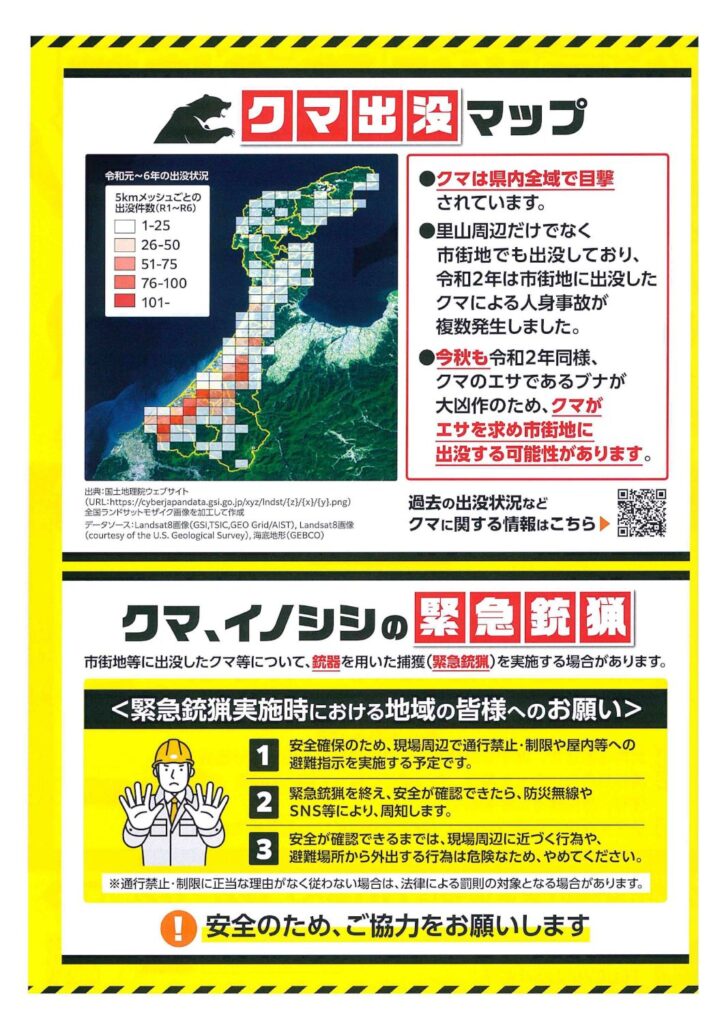 先月、9月12日に石川県よりクマ出没警戒情報が発令されました。