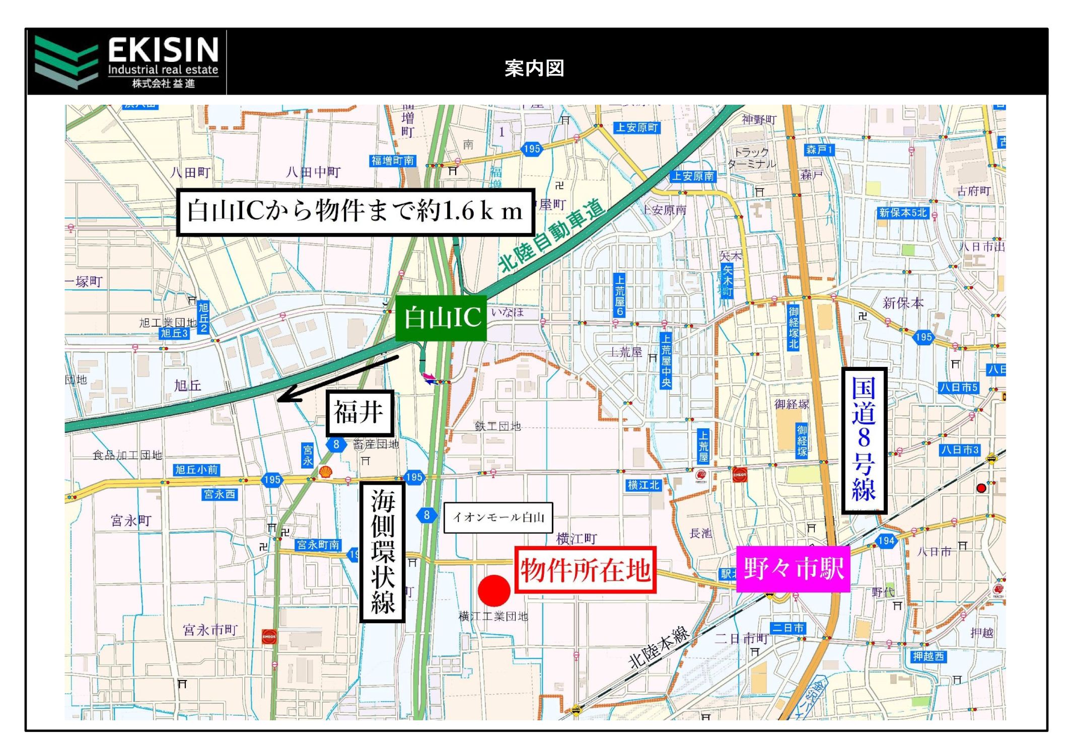 北陸自動車【白山IC】から約1.6km、【イオンモール白山】が徒歩圏内にございます。